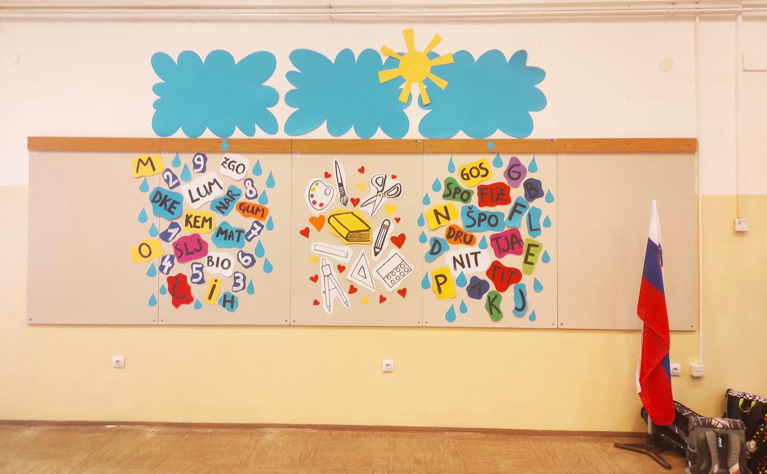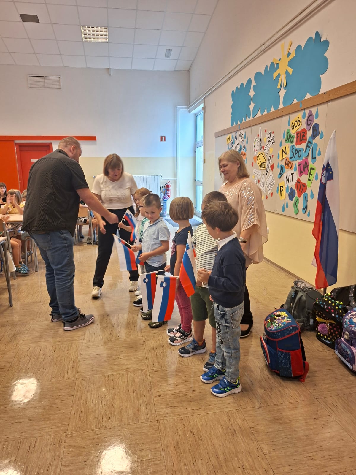 Vsi učenci – v letošnjem šolskem letu se jih bo po hodnikih sprehajalo 63 – so se najprej zbrali v šolski avli, kjer jih je pozdravila in nagovorila ravnateljica, ga. Danijela Likar; največ pozornosti so bili seveda deležni novi člani naše šolske skupnosti – šest prvošolcev: Adam, Filip, Katjuša, Tia, Tian in Tim. Sprejeli smo jih z močnim, opogumljajočim aplavzom. Šolo je obiskal tudi predstavnik Ministrstva za obrambo ter »prvčkom« po kratkem nagovoru podaril zastavico naše domovine Slovenije in jih spodbudil, naj z njo s pridom mahajo ob športnih in drugih dogodkih.