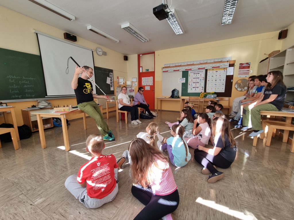 V sredo, 17. 9., so na obisk prišli člani Medobčinskega društva slepih in slabovidnih Nova Gorica. Najbolj nas je navdušil pes vodič, veliki koder Nils. Spremljala ga je vodnica Irena, ki je že od rojstva slepa. Zaupala nam je, da sta z Nilsem sama tudi že odpotovala z letalom v tujino, kar se nam je zdel, za slepega človeka, kar velik dosežek. Čeprav Irena ničesar ne vidi, nam je na Brajev pisalni stroj, zelo hitro in brez napak, natipkala naša imena.