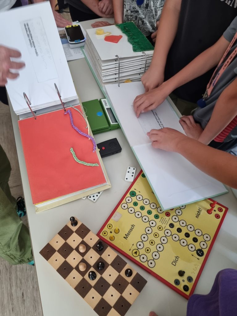 Poleg Irene sta nam veliko zanimivih pripomočkov pokazala tudi Peter in Lucija. Lucija je slabovidna oseba, kar pomeni, da tudi z očali ne vidi dobro. Videli smo časopis v brajici, kartonke za slepe otroke, družabne igre in druge pripomočke prilagojene slepim in slabovidnim.