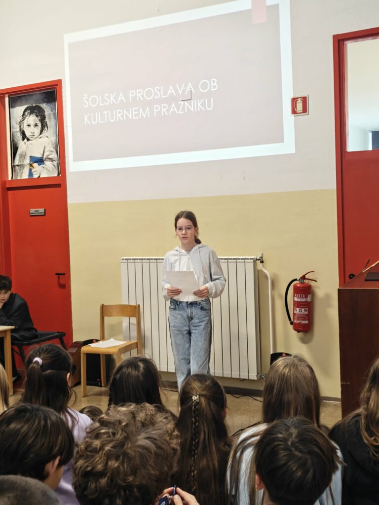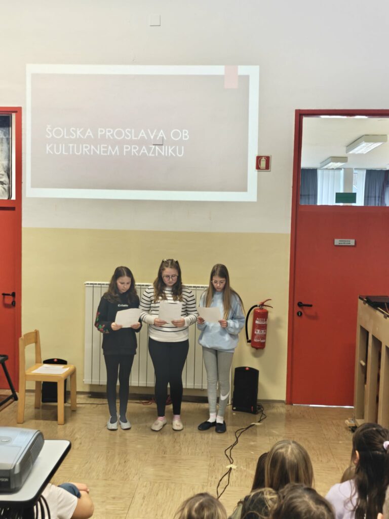 Program so obogatili še recitacija sedme kitice Zdravljice v angleškem jeziku, dve sodobni pesmi – Prebesedimo besede in Zimski športi – ter ubrano petje šolskega pevskega zbora s pesmijo O Vrba. Dogodek se je zaključil z nagovorom ravnateljice.